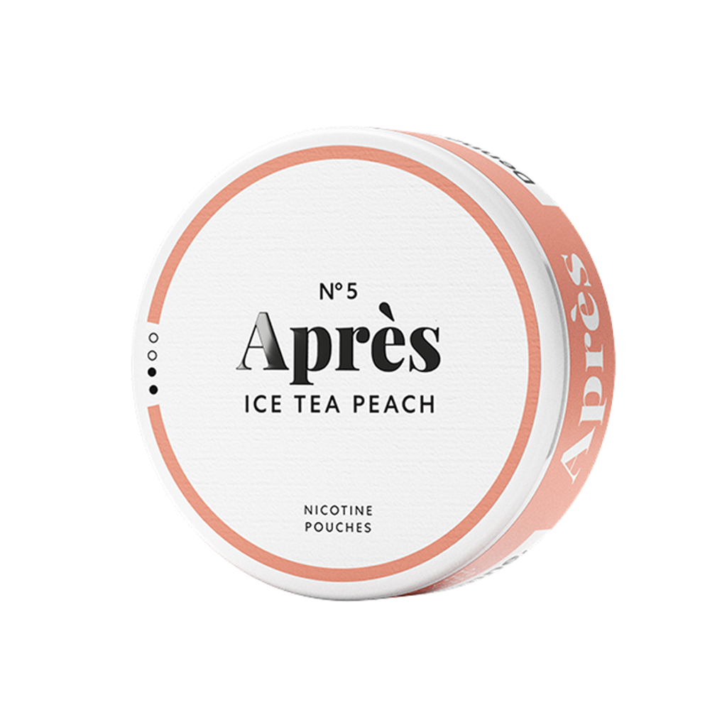 Ice Tea Peach från Après är ett vitt snus i slim-format med smak av persika och inslag av iste.
