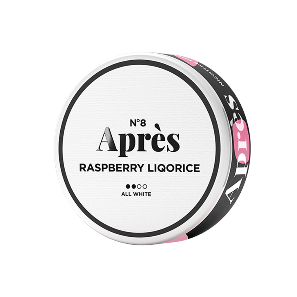 Raspberry Liqorice från Après är ett vitt snus i slim-format med smak av hallon och lakrits.