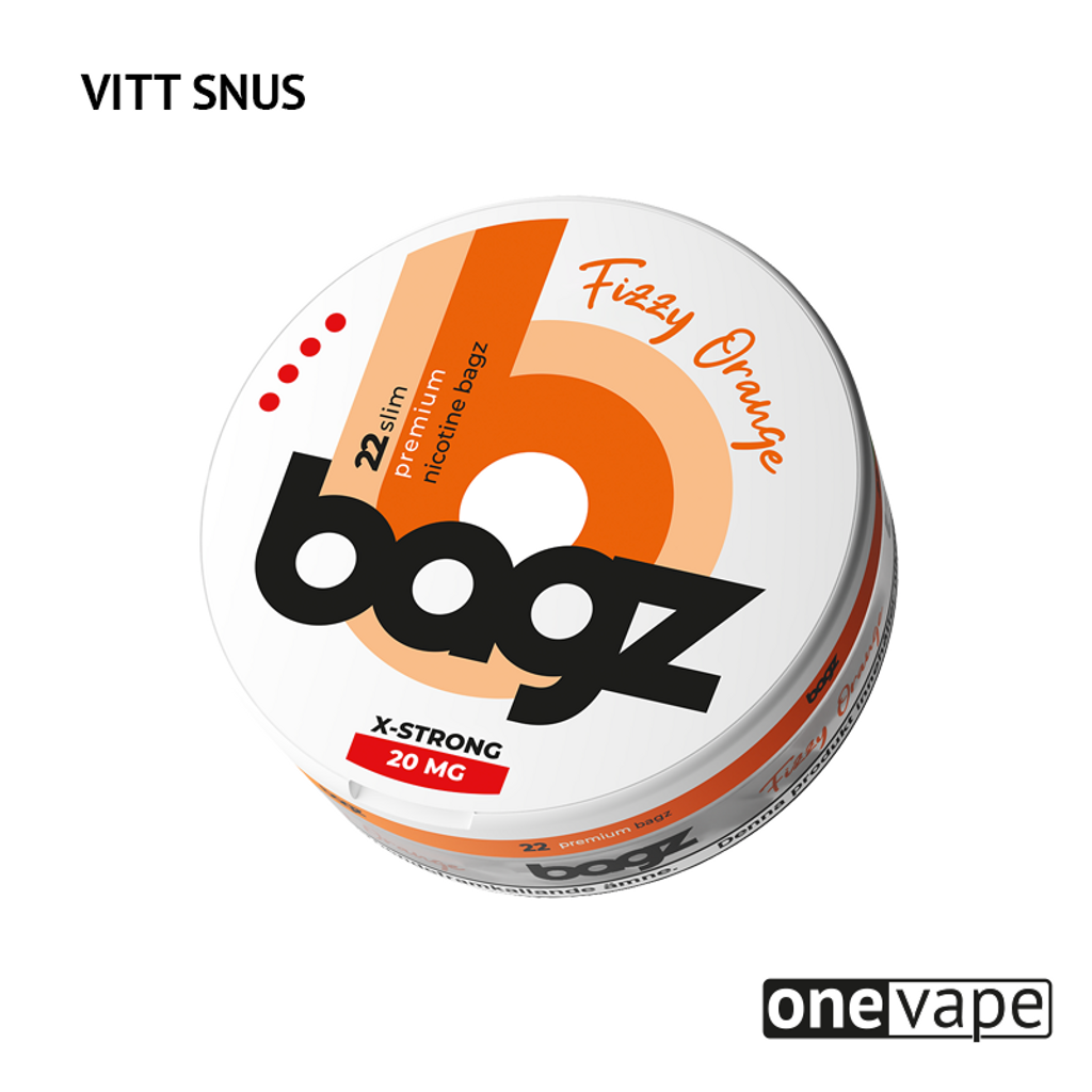 Fizzy Orange X-Strong från Bagz är ett vitt snus i slim-format med smak av uppfriskande och bubblande apelsin.