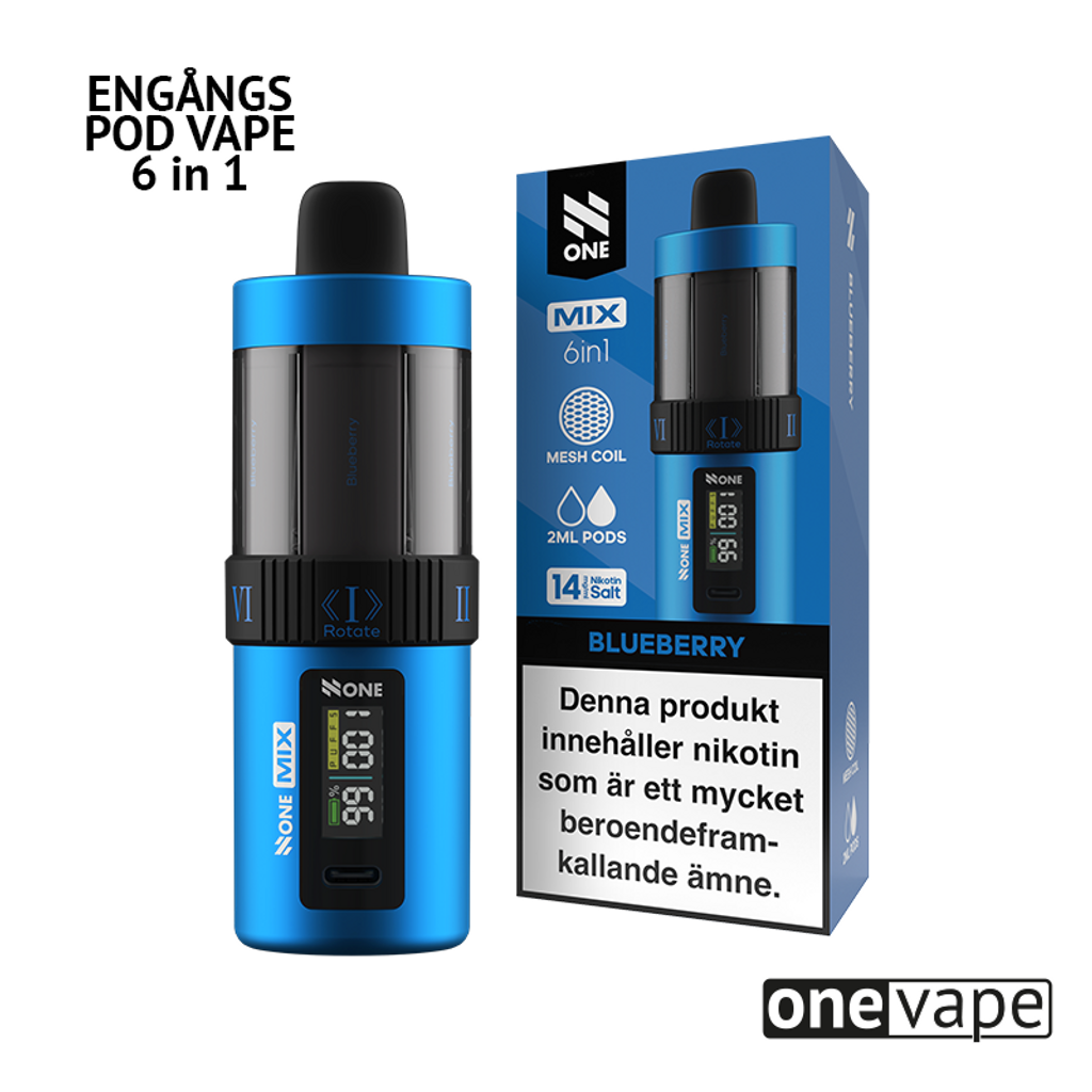 N One 6in1 engångsvape är en innovativ lösning för dem som söker en smidig och effektiv vejpupplevelse. Den levereras med sex stycken 2ml pods, vilket innebär att du som användare kan enkelt byta mellan olika pods utan krångel. Du vrider enkelt på enheten för att byta mellan pod/smak, när en pod är slut fortsätter du på den andra. Denna design gör att N One 6in1 är TPD-godkänd. Med ett inbyggt 1100mah-batteri erbjuder denna engångsvape tillräckligt med ström för att ge många puffar som räcker dig hela dagen.