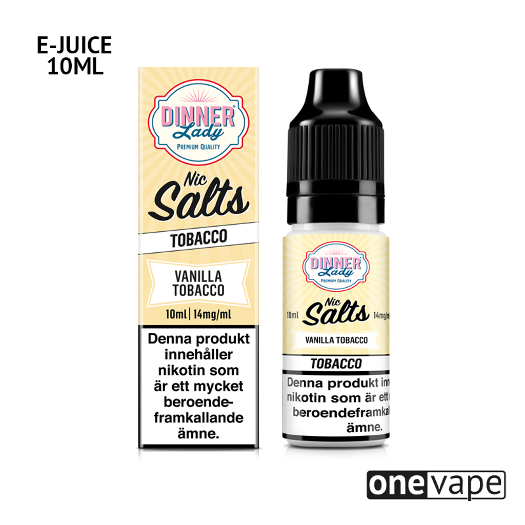 10ml E-juice med 14mg Nicsalt från Dinner Lady med smak av vanilj och tobak.