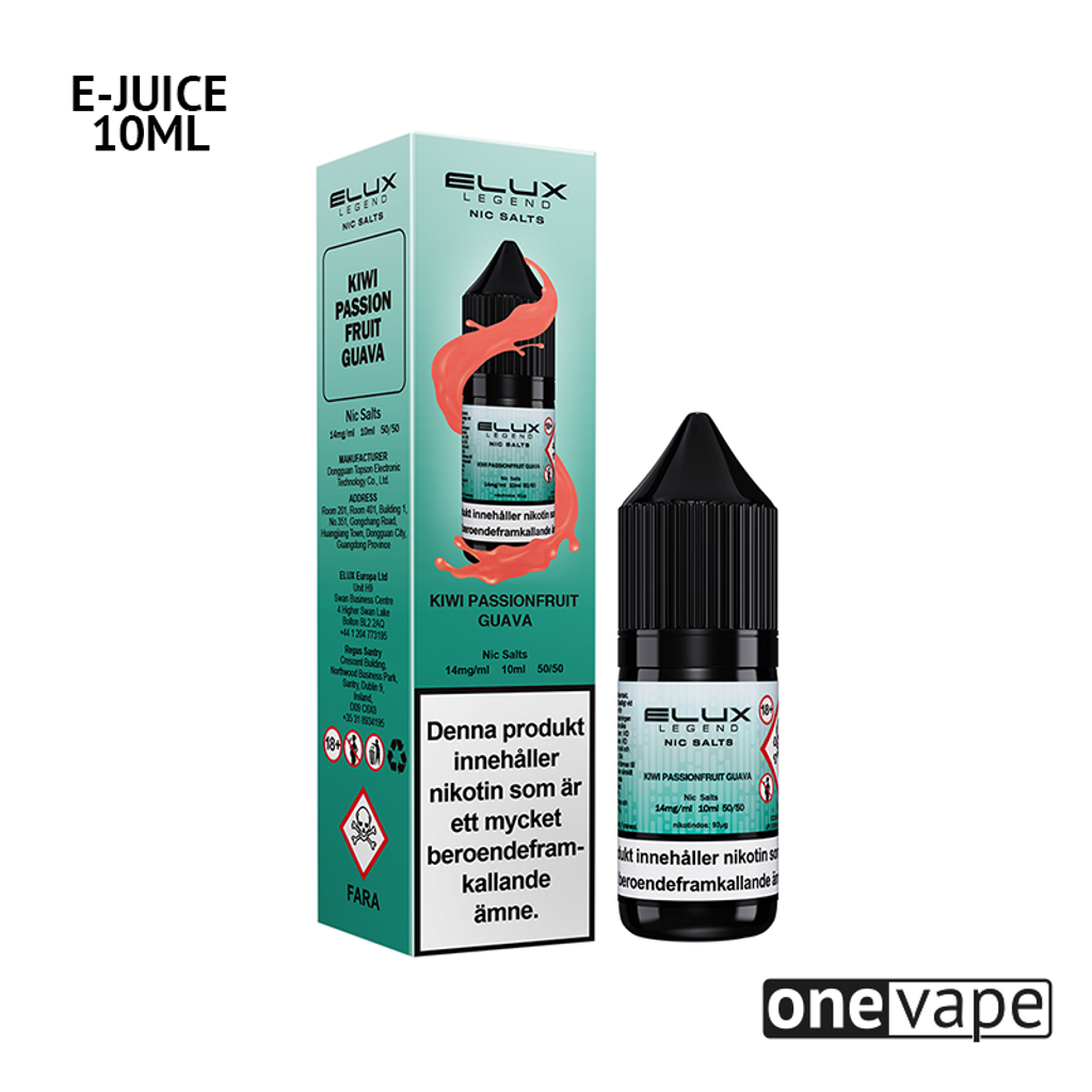 10ml E-juice med 14mg Nicsalt från Elux Legend med smak av kiwi, passionsfrukt och guava.