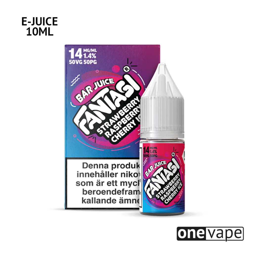 10ml E-juice med 14mg Nicsalt från Fantasi med smak av jordgubb, hallon, körsbär och cooling.