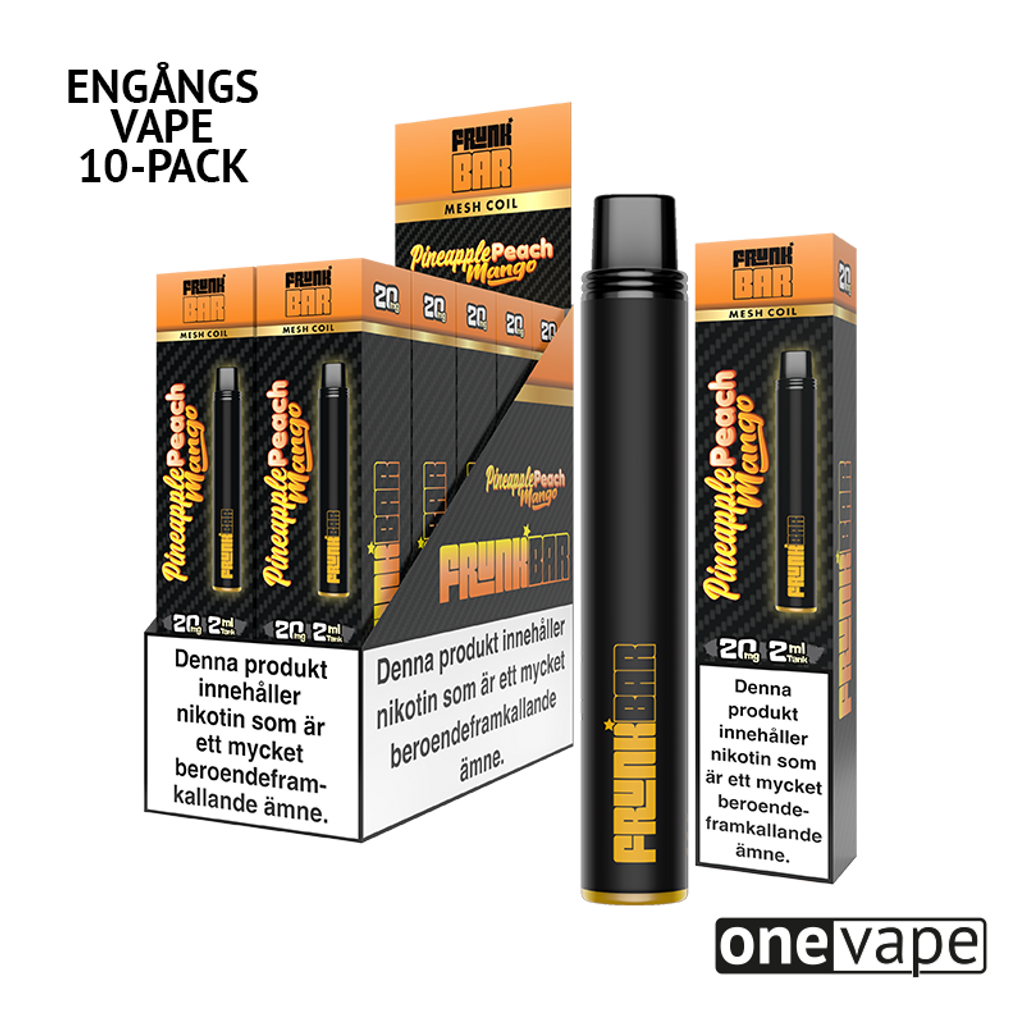Storpack (10-Pack) Frunk Bar Engångsvape 20mg med smak av ananas, persika och mango.