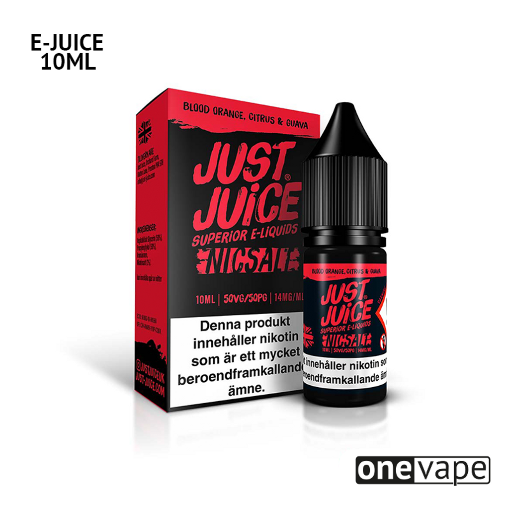 10ml E-juice med 14mg Nicsalt från Just Juice med smak av blodapelsin, citron och guava.