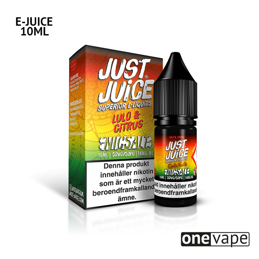 10ml E-juice med 14mg Nicsalt från Just Juice med smak av citrus och lulo (påminner om rabarber, lime och ananas).