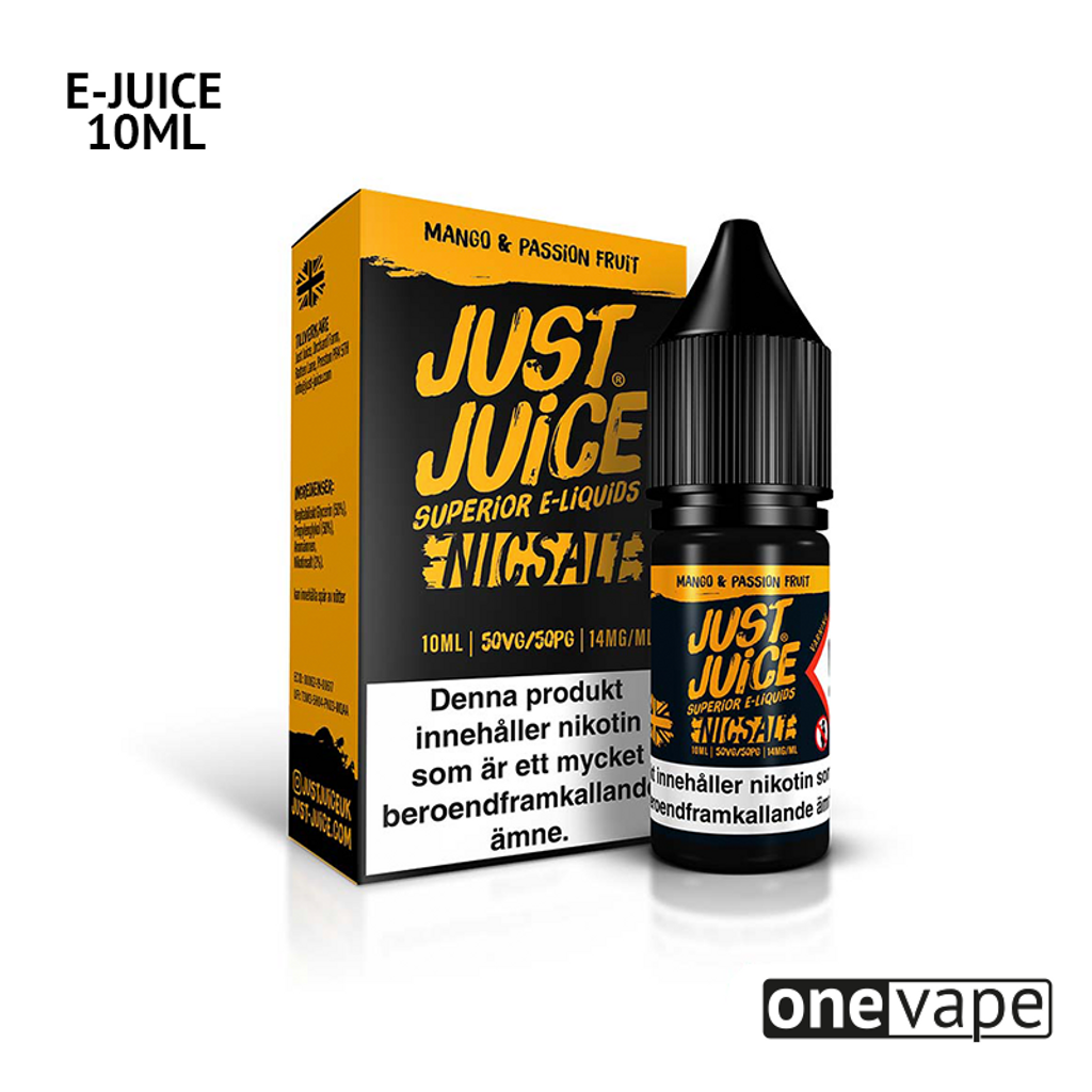10ml E-juice med 14mg Nicsalt från Just Juice med smak av mango och passionsfrukt.