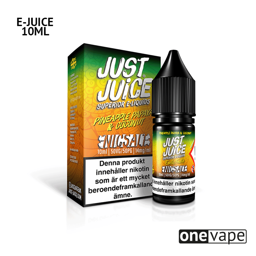 10ml E-juice med 14mg Nicsalt från Just Juice med smak av ananas, papaya och kokosnöt.