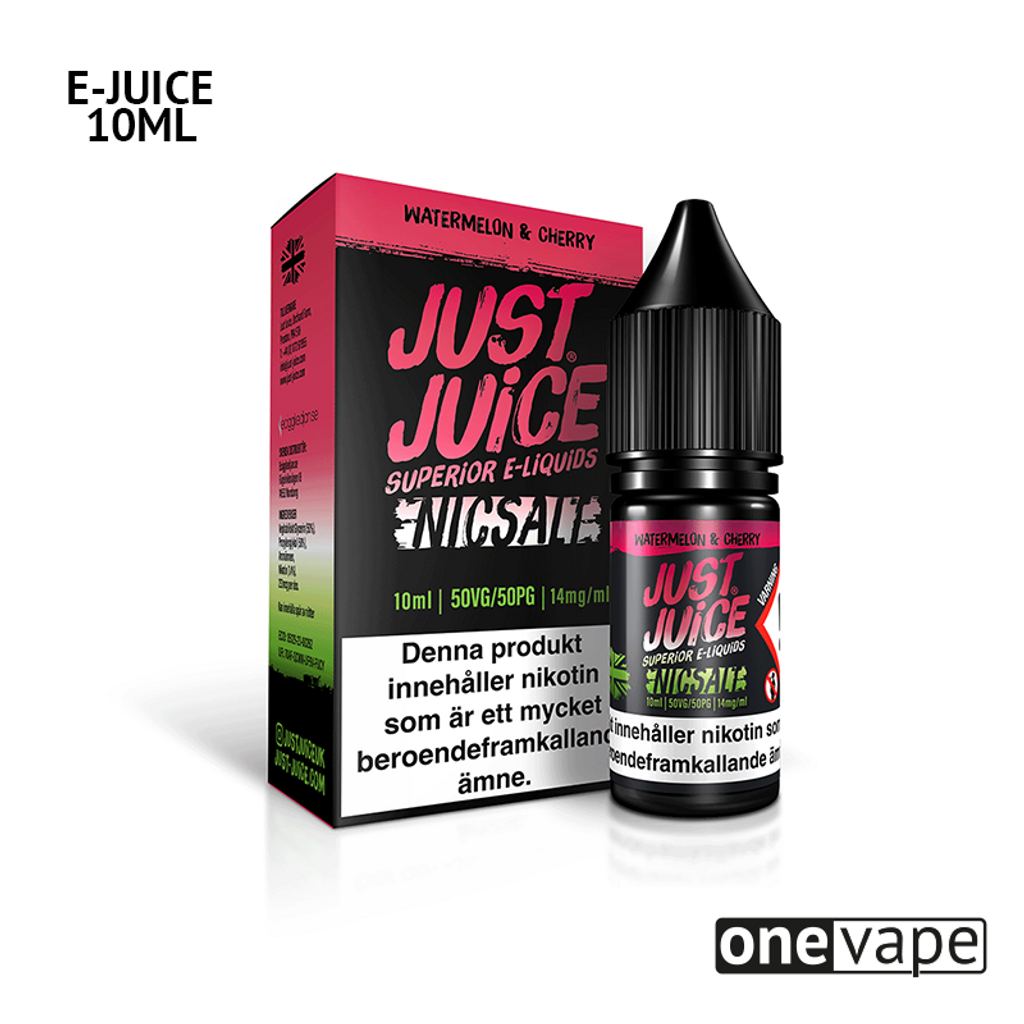 10ml E-juice med 14mg Nicsalt från Just Juice med smak av vattenmelon och körsbär.