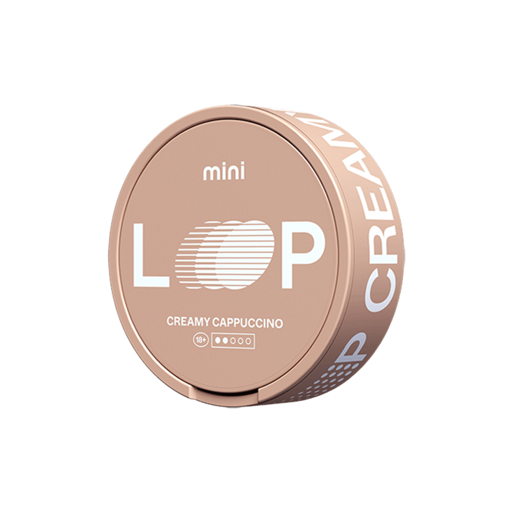Creamy Cappuccino Normal från LOOP är ett vitt snus i mini-format med smak av kaffe och hasselnöt.