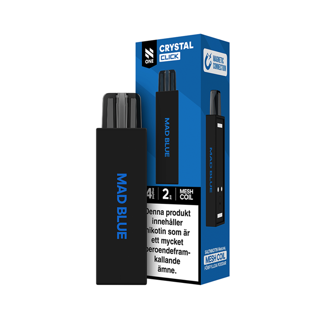 N One Crystal Click Mesh Pod – Mad Blue är en förfylld pod med smak av blåbär, hallon och svartvinbär. Avsedd att användas tillsammans med ett kompatibelt Click Mesh-batteri (säljs separat). Podden klickas på plats och aktiveras vid inhalering. Produkten saknar knappar och inställningar.