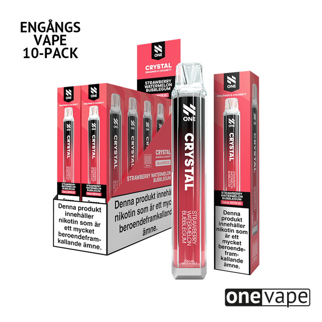Storpack (10st) N One Crystal Engångsvape 20mg med smak av jordgubb, vattenmelon och tuggummi.