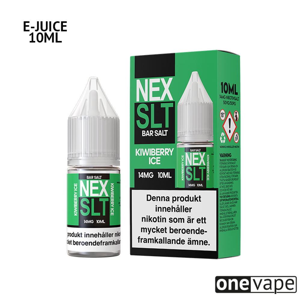 10ml E-juice med 14mg Nicsalt från NEX SLT med smak av kiwi, jordgubb och cooling.