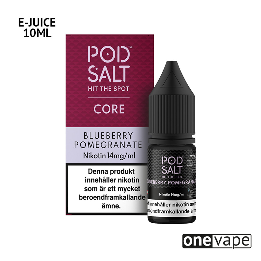 10ml E-juice med 14mg Nicsalt från Pod Salt, med smak av blåbär och granatäpple.