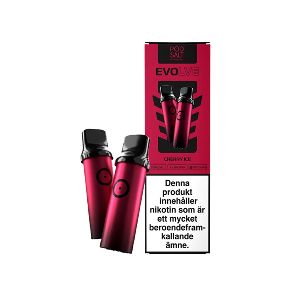 Evolve Mesh Pod – Cherry Ice (2-pack) är ett paket med två förfyllda poddar med smak av körsbär. Avsedd att användas tillsammans med ett kompatibelt Mesh Pod Kit-batteri (säljs separat). Podden klickas på plats och aktiveras vid inhalering. Produkten saknar knappar och inställningar.