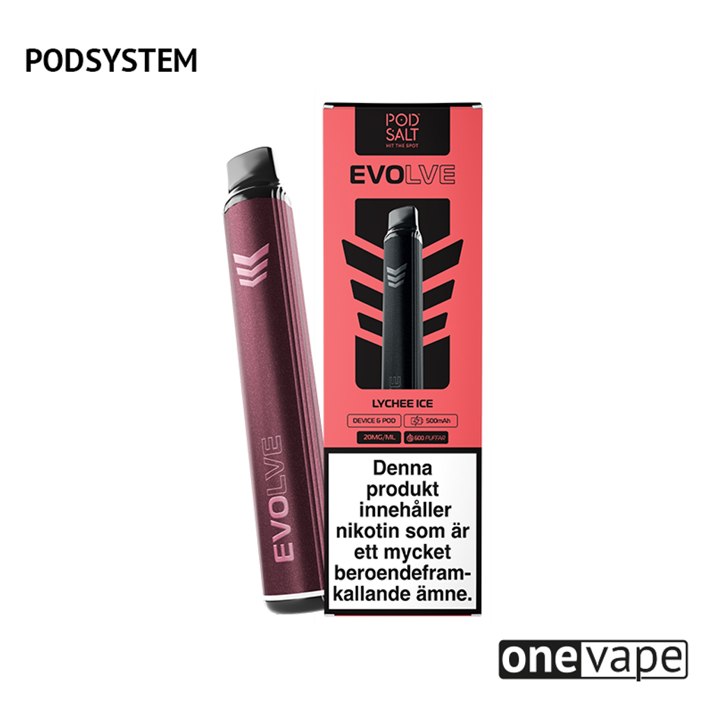Podsystem med 1st 500mAh batteri och 1st förfylld Evolve Mesh Pod med smak av litchi och cooling.
