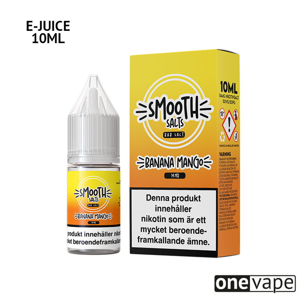 10ml E-juice med 14mg Nicsalt från Smooth Salts med smak av banan och mango.