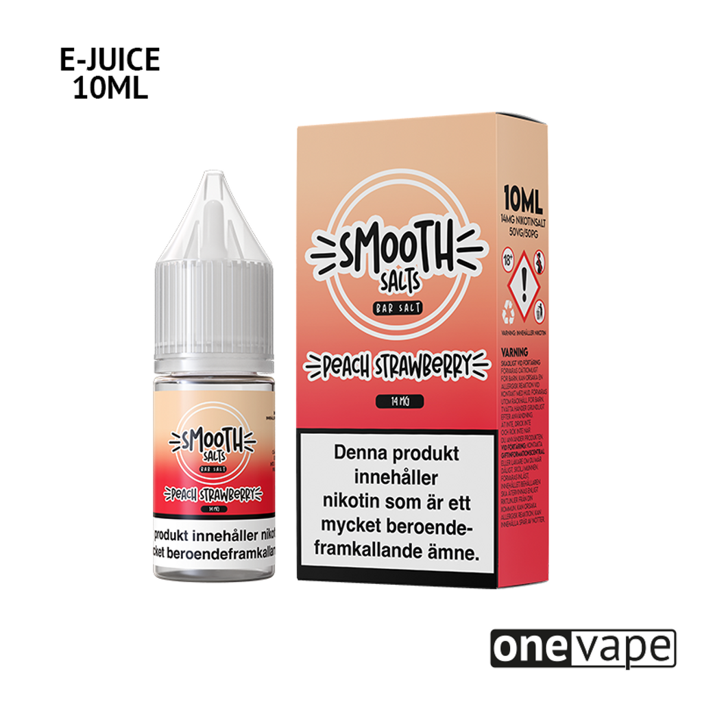 10ml E-juice med 14mg Nicsalt från Smooth Salts med smak av persika och jordgubbar.
