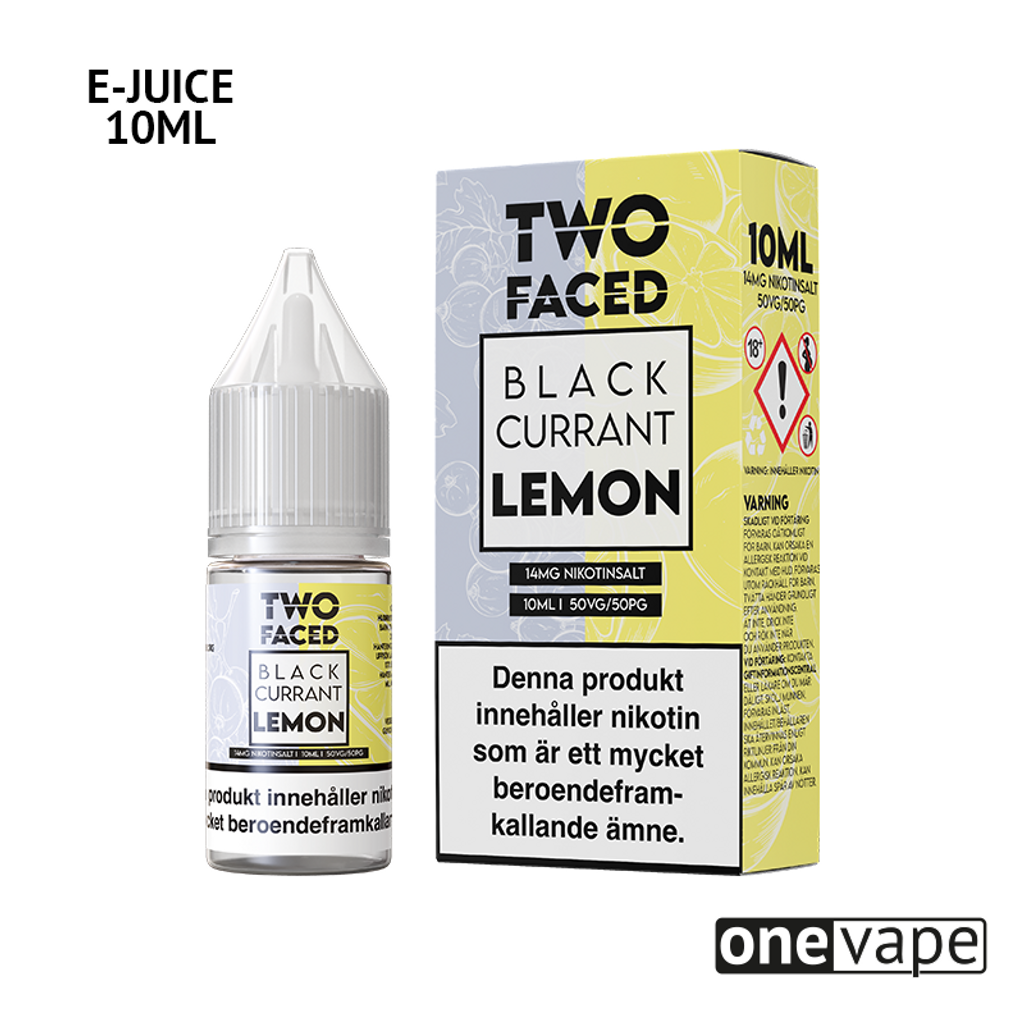 10ml E-juice med 14mg Nicsalt från Two Faced med smak av svartvinbär och citron.