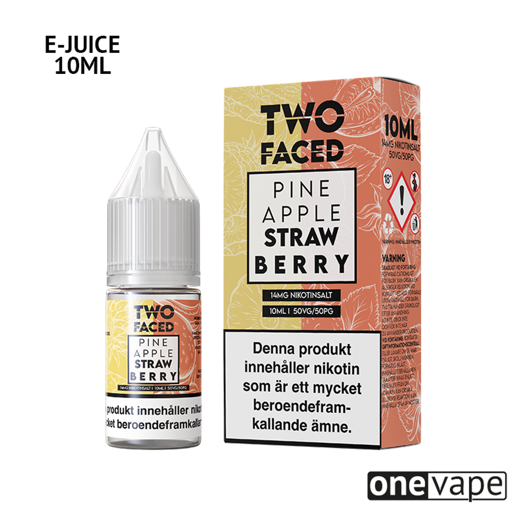10ml E-juice med 14mg Nicsalt från Two Faced med smak av ananas och jordgubb.