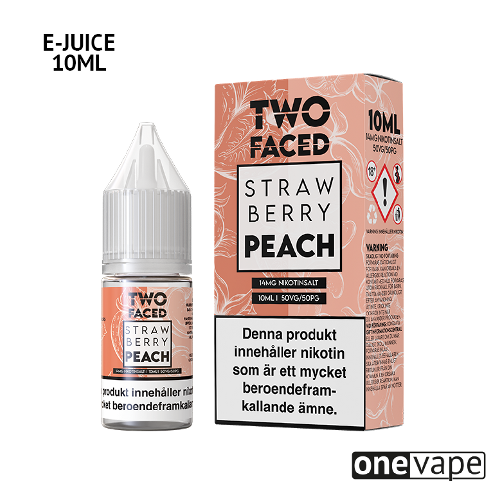 10ml E-juice med 14mg Nicsalt från Two Faced med smak av jordgubb och persika.