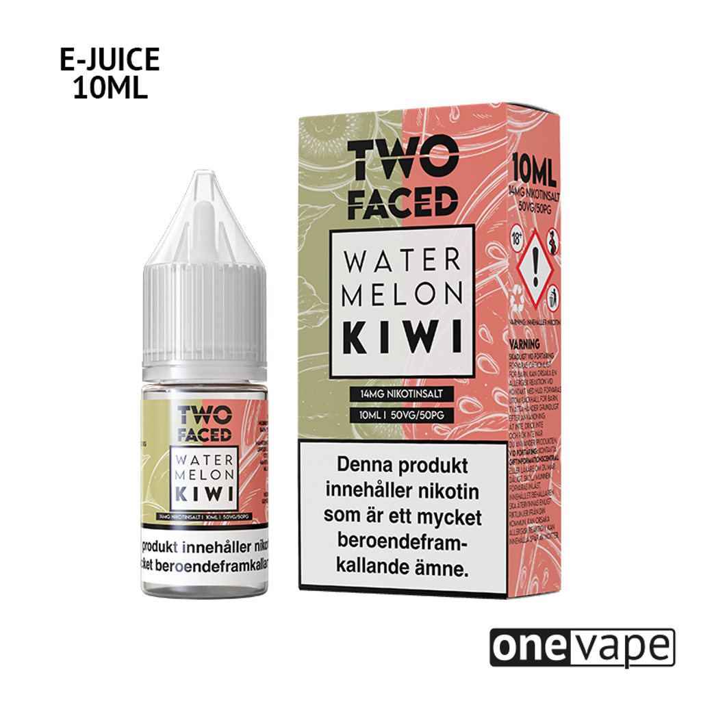 10ml E-juice med 14mg Nicsalt från Two Faced med smak av vattenmelon och kiwi.