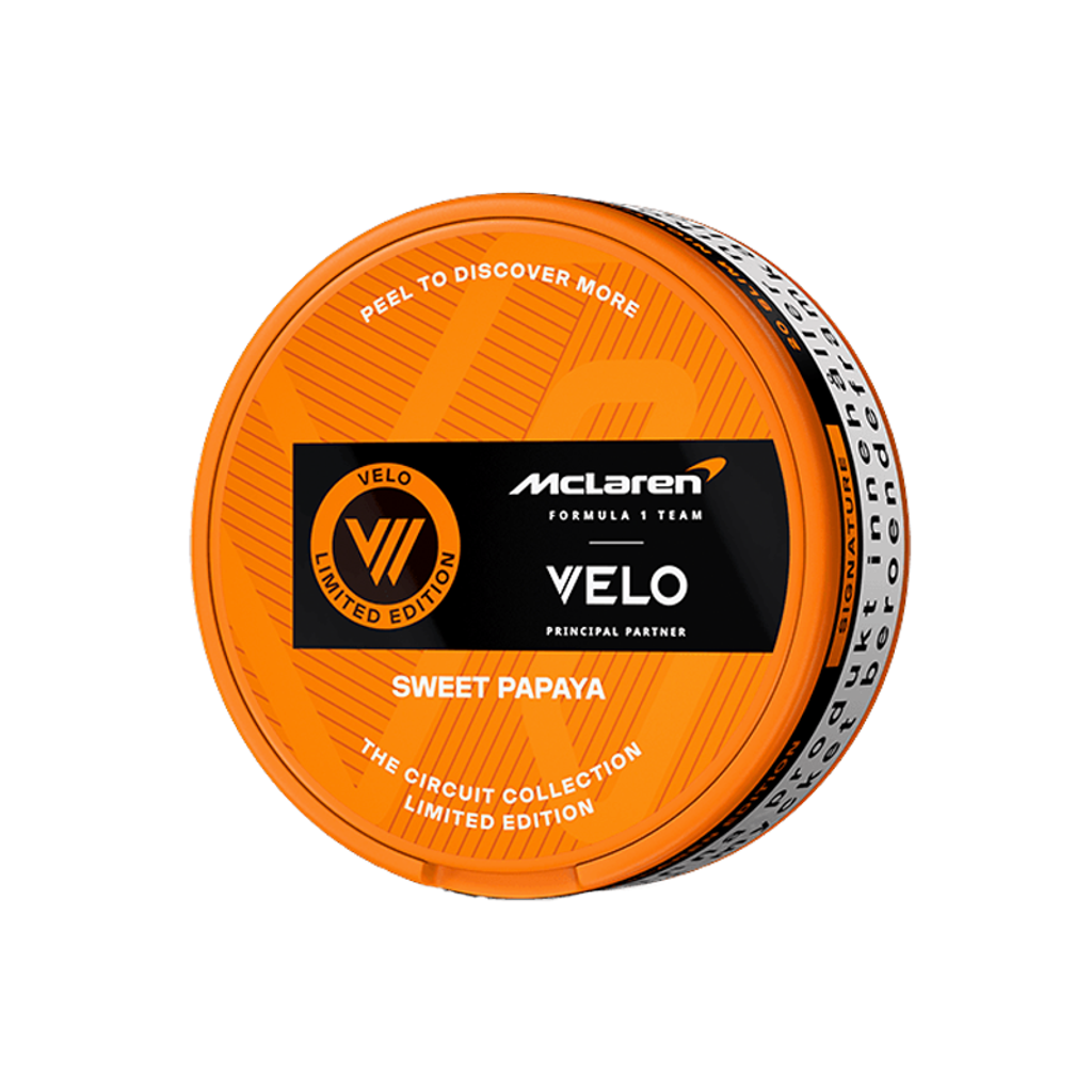 Sweet Papaya från VELO är en limiterad utgåva i samarbete med McLaren, med smak av söt papaya med en krämig ton.