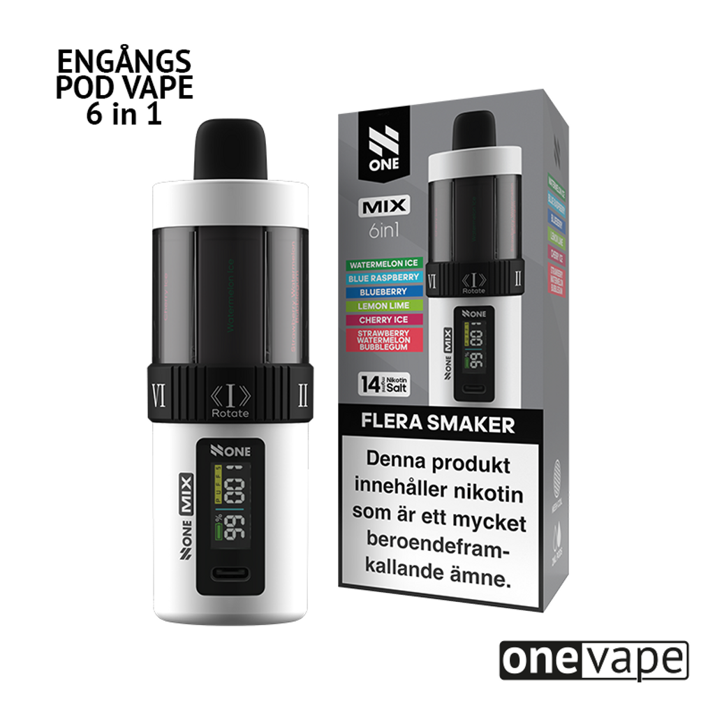 N One 6in1 engångsvape är en innovativ lösning för dem som söker en smidig och effektiv vejpupplevelse. Den levereras med sex stycken 2ml pods, vilket innebär att du som användare kan enkelt byta mellan olika pods utan krångel. Du vrider enkelt på enheten för att byta mellan pod/smak, när en pod är slut fortsätter du på den andra. Denna design gör att N One 6in1 är TPD-godkänd. Med ett inbyggt 1100mah-batteri erbjuder denna engångsvape tillräckligt med ström för att ge många puffar som räcker dig hela dagen.